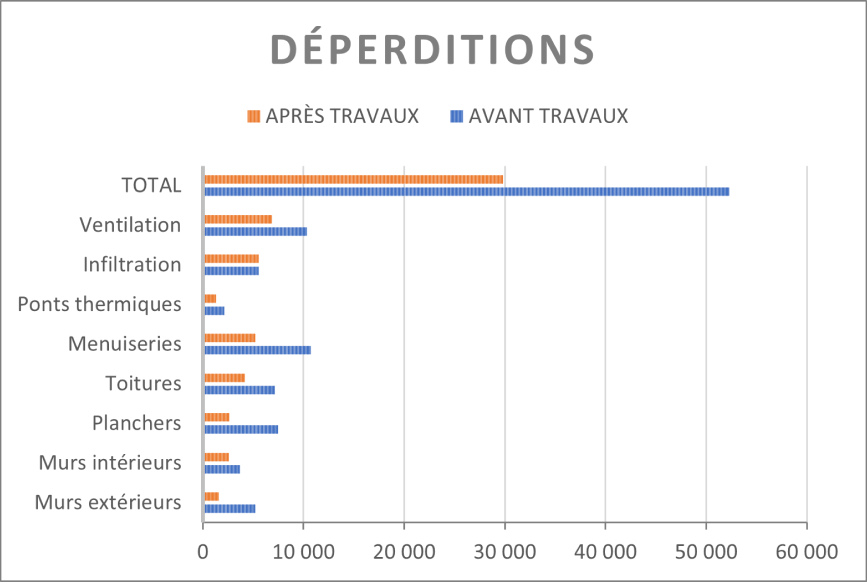 Notre prestation d’étude RT Existant inclut également l’évaluation des déperditions pièce par pièce après les travaux de rénovation.